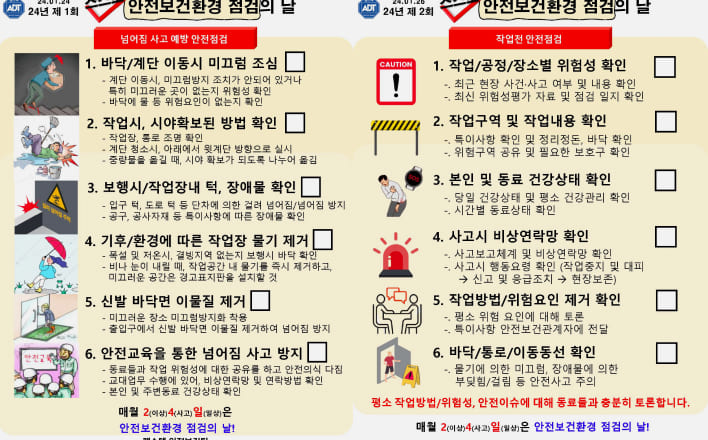 위험요인 및 재해를 예방하기 위한 재해사례 전파 등을 통해 종업원의 자가점검 역량을 향상시킵니다. 또한 구성원 및 협력사를 대상으로 안전보건 점검의 날을 운영하여
